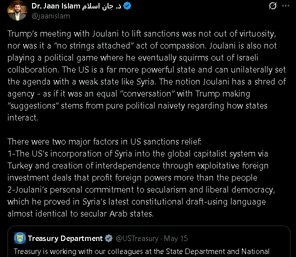 It’s clear by now that they were led on to think things would be otherwise by his alleged past positions and fantastical history as a Salafi Jihadist who survived the GWOT unscathed, unlike many of his “colleagues,” who were all killed within short order of the USA diving headfirst into the Middle East militarily. To be honest, the fact that “otherwise” didn’t happen was a very pleasant surprise to me and my friends. We didn’t expect him to immediately mend a variety of foreign relations, even unexpected ones, keep diplomatic channels open for the rest, and overall be the kind of leader whose striking deals first and foremost to get Syria to be a country that keeps the lights on and has functioning infrastructure as opposed to immediately chimping on the Syrian people with mandatory niqab laws, banning women’s education, and declaring eternal war on the US and Israel.
