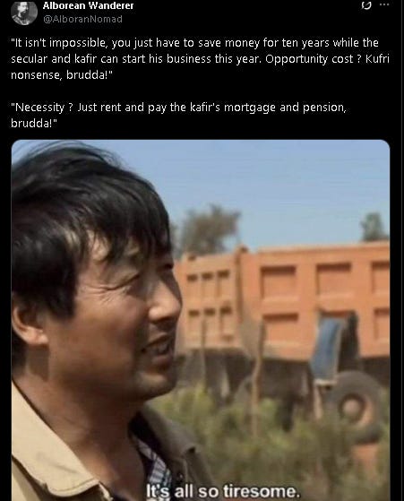 I want you to think about this sentence. What does it truly mean to “deserve” something? Every time you hear this line or one of its variants, that the Ummah needs X or will win in Y in the near future, do you see that energy reflected in reality? Or are you just being injected with another dose of copium from the X pages of slop posters (who I won’t name)? The implication from these people is always that, because of the inherent religiosity of the Muslim world that they’ve supposedly maintained until now, they deserve and will attain some physical or material victory in the future against the West (or more commonly spoken of, Israel).